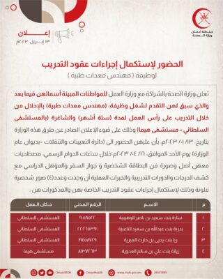 تعلن وزارة الصحة بالشراكة مع وزارة العمل للمواطنات المبينة أسمائهن فيما بعد والذي سبق لهن التقدم لشغل وظيفة: مهندس معدات طبية بالإحلال من خلال التدريب على رأس العمل لمدة ستة أشهر والشاغرة بالمستشفى السلطاني – مستشفى هيما وذلك على ضوء الإعلان الصادر عن طرق هذه الوزارة بتاريخ : ٢٠٢٣/٠١/١٣م ، بأن عليهن الحضور الى دائرة) التعيينات والتنقلات – بديوان عام الوزارة) يوم الأحد الموافق: ٢٠٢٣/٠٤/١٦م خلال ساعات الدوام الرسمي، مصطحبات معهن أصل وصورة من البطاقة الشخصية وجواز السفر والمؤهل الدراسي مع كشف الدرجات والدورات التدريبية والخبرات العملية أن وجدت وعدد (4) صور شخصية ملونة وذلك لإستكمال إجراءات عقود التدريب الخاصة بهن .
