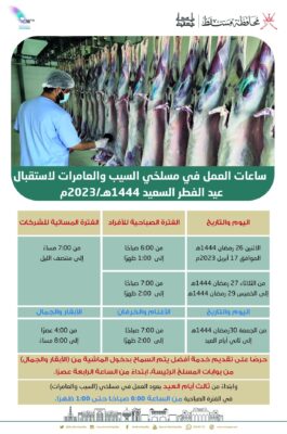 ولتسريع آلية عمل الذبح وتسليمها للجمهور ولتفادي الضغط المتزايد، سيتم تخصيص جميع فترات العمل للجمهور فقط من يوم الجمعة 30 رمضان 1444ه إلى ثاني أيام عيد الفطر السعيد، حيث تكون الفترة الصباحية من الساعة (7 صباحاَ الى الساعة 2 ظهرا) لذبح الماشية من الاغنام والماعز فقط، أما الفترة المسائية من الساعة (4 عصرا الى الساعة 8 مساءً) تم تحديدها لذبح الماشية من الأبقار والجمال فقط.