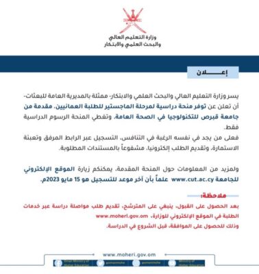 أعلنت وزارة التعليم العالي والبحث العلمي والابتكار عبر حسابها الرسمي على موقع التواصل الاجتماعي تويتر عن منحة دراسية لمرحلة الماجستير للطلبة العمانيين مقدمة من جامعة قبرص للتكنولوجيا في الصحة العامة.