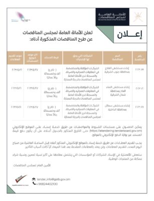 اعلنت الأمانة العامة لمجلس المناقصات عن طرح المناقصات التالية وهي إنشاء مستشفى الفلاح بمحافظة جنوب الشرقية. وإنشاء مستشفى النماء العام بمحافظة شمال الشرقية، وكذلك إنشاء مستشفى سمائل بمحافظة الداخلية.