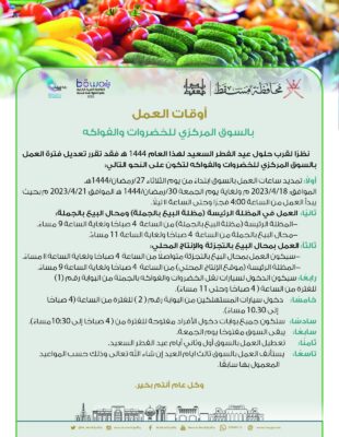 عدلت بلدية مسقط فترة العمل بالسوق المركزي للخضروات والفواكه وذلك نظرا لقرب حلول عيد الفطر السعيد لهذا العام 1444 هـ فقد تقرر تعديل لتكون ع النحو التالي :