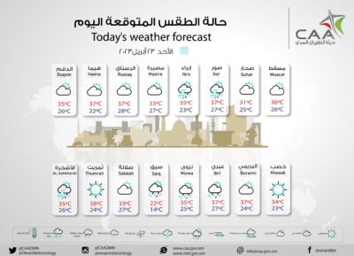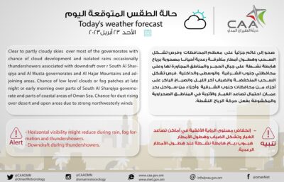 نشرت الارصاد العمانية حالة الطقس المتوقعة اليوم ، صحو إلى غائم جزئياً على معظم المحافظات وفرص تشكل السحب وهطول أمطار متفرقة رعدية أحيانا مصحوبة برياح هابطة نشطة على جبال الحجر والمناطق المجاورة لها وعلى محافظتي جنوب الشرقية والوسطى والداخلية . فرص تشكل السحب المنخفضة والضباب آخر الليل والصباح الباكر على أجزاء من محافظات جنوب الشرقية وأجزاء من سواحل بحر عمان. احتمال تصاعد الغبار والأتربة في المناطق الصحراوية والمكشوفة بفعل حركة الرياح النشطة.