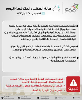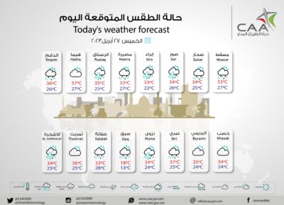نشرت الارصاد العمانية حالة الطقس المتوقعة اليوم ، تشكل السحب الركامية وهطول أمطار متفرقة رعدية أحيانا مصحوبة برياح هابطة نشطة وتساقط حبات البرد على محافظات جنوب الشرقية وشمال الشرقية والوسطى وأجزاء من المناطق الجبلية من محافظات مسقط والداخلية وجنوب الباطنة وشمال الباطنة والظاهرة والبريمي وظفار.