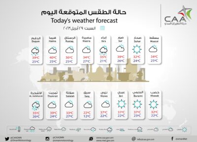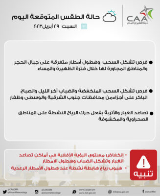 أعلنت هيئة الأرصاد الجوية عبر صفحتها الرسمية على موقع التواصل الاجتماعي تويتر ، عن فرص تشكل السحب وهطول أمطار متفرقة على جبال الحجر والمناطق المجاورة لها خلال فترة الظهيرة والمساء