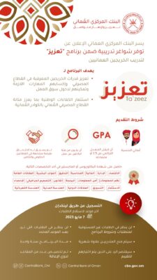 اعلن البنك المركزي العماني عن توفر شواغر تدريبية ضمن برنامج “تعزيز” لتدريب الخريجين العُمانيين حسب التفاصيل في المنشور |
