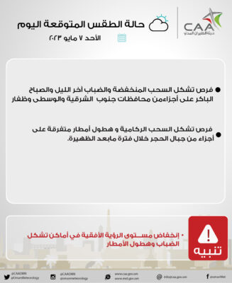 نشرت الارصاد العمانية حالة الطقس المتوقعة اليوم ، فرص تشكل السحب المنخفضة والضباب آخر الليل والصباح الباكر على أجزاء من محافظات جنوب الشرقية والوسطى وظفار وايضًا  فرص تشكل السحب الركامية و هطول أمطار متفرقة على أجزاء من جبال الحجر خلال فترة ما بعد الظهيرة.