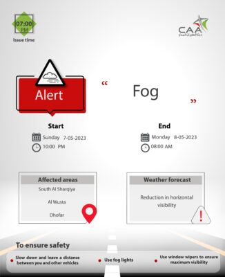أعلنت هيئة الأرصاد الجوية عبر حسابها الرسمي على موقع التواصل الاجتماعي تويتر، عن فرص تشكل السحب المنخفضة/ الضباب وانخفاض في مستوى الرؤية الأفقية أحيانًا فترة آخر الليل والصباح الباكر من يوم غد الإثنين على أجزاء من محافظات جنوب الشرقية والوسطى وظفار.