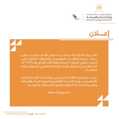 اعلنت وزارة التراث والسياحة عن استقبال طلبات تراخيص تنظيم رحلات سياحة المغامرات للمؤسسات والشركات الحاصلة على ترخيص مشغلي الجولات السياحية، كما تعلن عن استقبال طلبات الإرشاد التخصصي لأنشطة سياحة المغامرات.