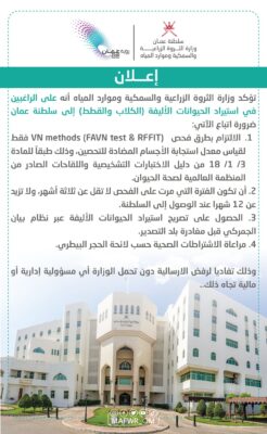 تؤكد وزارة الثروة الزراعية والسمكية وموارد المياه أنه على الراغبين : في استيراد الحيوانات الأليفة الكلاب والقطط إلى سلطنة عمان ضرورة اتباع الآتي: 1. الالتزام بطرق فحص V methods (FAVN test & FIT فقط لقياس معدل استجابة الأجسام المضادة للتحصين، وذلك طبقاً للمادة : 3/ 1/ 18 من دليل الاختبارات التشخيصية واللقاحات الصادر من : المنظمة العالمية لصحة الحيوان. 2. أن تكون الفترة التي مرت على الفحص لا تقل عن ثلاثة أشهر، ولا تزيد عن 12 شهرا عند الوصول إلى السلطنة. 3. الحصول على تصريح استيراد الحيوانات الأليفة عبر نظام بيان الجمركي قبل مغادرة بلد التصدير. 4. مراعاة الاشتراطات الصحية حسب لائحة الحجر البيطري. وذلك تفاديا لرفض الارسالية دون تحمل الوزارة أي مسؤولية إدارية أو مالية تجاه ذلك.