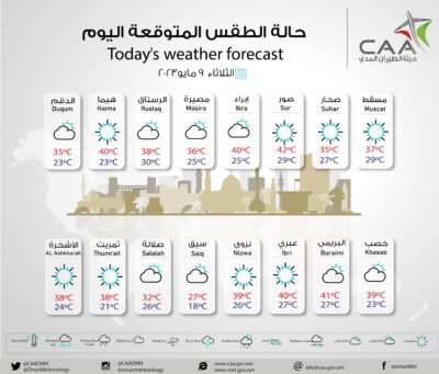نشرت الارصاد العمانية حالة الطقس المتوقعة اليوم ، فرص تشكل السحب المنخفضة والضباب آخر الليل والصباح الباكر على أجزاء من محافظات جنوب الشرقية والوسطى وظفار صحو بوجه عام مع فرص تدفق السحب العالية وتشكل السحب الركامية على أجزاء من جبال الحجر خلال فترة ما بعد الظهيرة. تصاعد الغبار والأتربة بفعل حركة الرياح النشطة على المناطق الصحراوية والمكشوفة