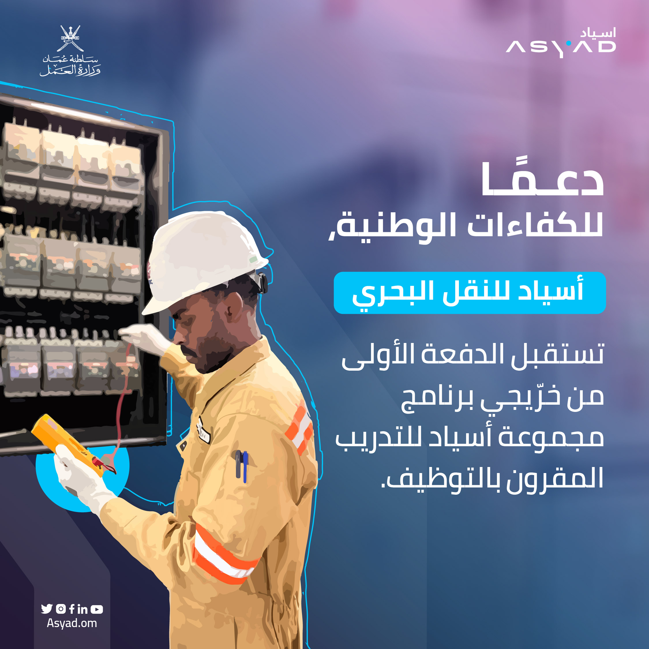 أعلنت مجموعة أسياد للنقل البحري على حسابها الرسمي على موقع التواصل الاجتماعي تويتر، بتعزّيز خدماتها بتوظيف كفاءات وطنية من خريجي الدفعة الأولى من برنامج أسياد للتدريب المقرون بالتوظيف من فنّيي الكهرباء المتخصصين والحاصلين على شهادة الكفاءة الفنّية بالتعاون مع  وزارةالعمل، مؤكدة التزام مجموعة أسياد بالتعمين وتأمين فرص عمل للشباب العُماني.