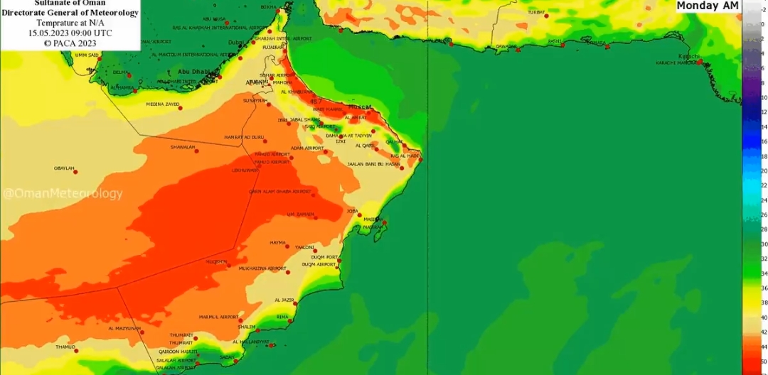أعلنت هيئة الأرصاد الجوية عن استمرار الارتفاع في درجات الحرارة العظمى اليوم ويوم غد قد تتجاوز منتصف الأربعينات على بعض المناطق في محافظات شمال الباطنة وجنوب الباطنة ومسقط والمناطق الصحراوية لمحافظات الظاهرة والوسطى و ظفار