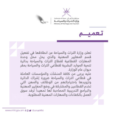 تعلن وزارة التراث والسياحة عن انطلاقها في تفعيل قسم المعايير المهنية والذي يحل محل وحدة المهارات القطاعية لقطاع التراث والسياحة بدائرة الموارد البشرية لقطاعي التراث والسياحة بالوزارة.