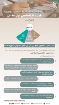 أصدر معالي الدكتور هلال بن علي بن هلال السبتي – وزير الصحة – قراراً وزارياً جديداً بشأن ضوابط تقييم المتقدمين لشغل وظيفة طبيب اختصاصي أول فأعلى.