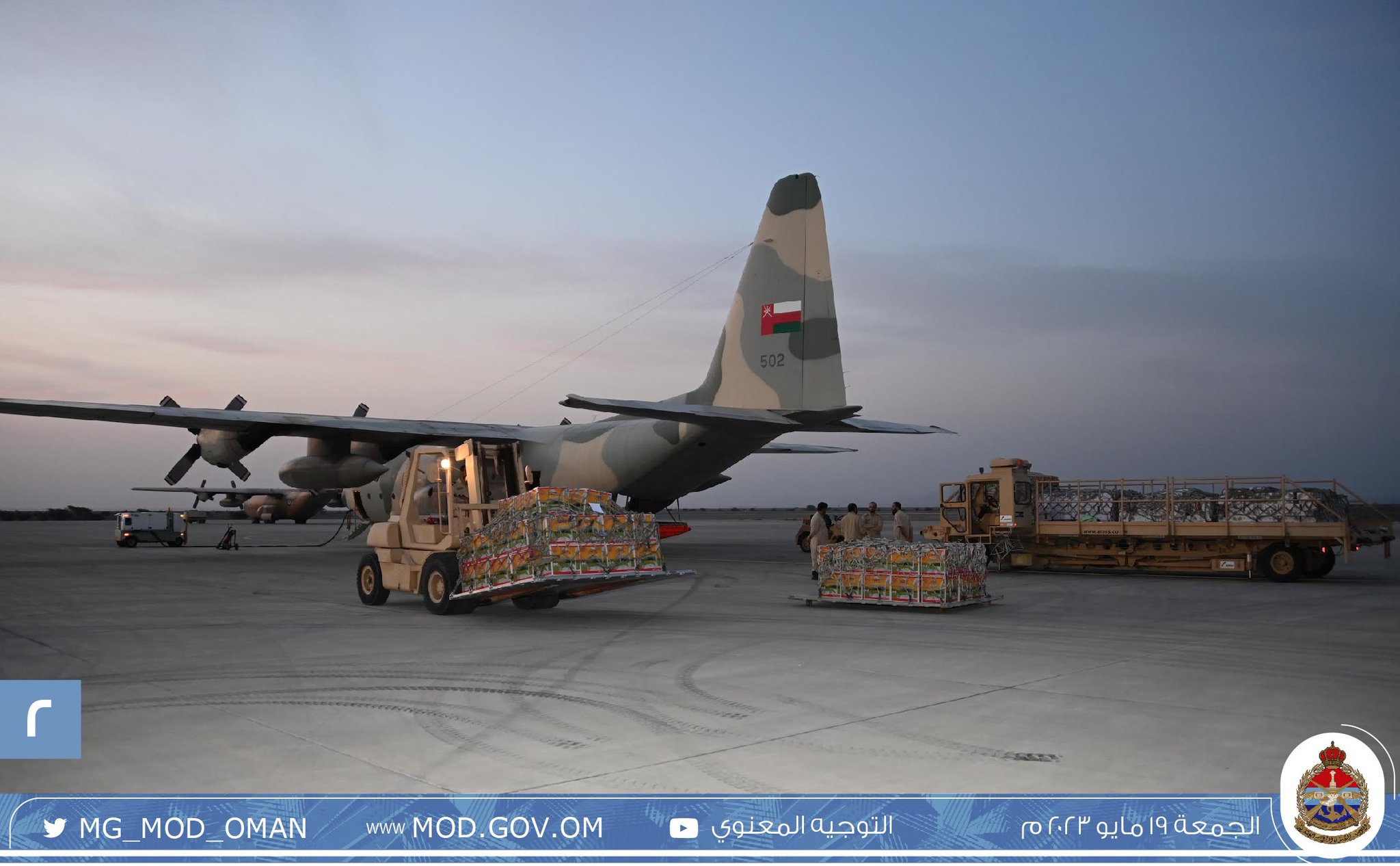 تجسيداً للتوجيهات السامية لحضرة صاحب الجلالة السلطان هيثم بن طارق المعظم -حفظه الله ورعاه- تسير سلطنة عمان ممثلة بالهيئة العمانية للأعمال الخيرية وبالتعاون مع سلاح الجو السلطاني العماني رحلات إغاثة جوية إلى جمهورية السودان وذلك بواسطة عدد من طائرات النقل العسكرية بسلاح الجو السلطاني العماني التي انطلقت أولى رحلاتها اليوم وتحمل على متنها مواد إغاثية متنوعة واحتياجات إنسانية ضرورية ضمن جسر إغاثة جوي يتضمن عدداً من الرحلات على مدى الأيام المقبلة تضامنا مع جمهورية السودان الشقيقة. يأتي تسيير هذه الرحلات الإغاثية في إطار الجهود الإنسانية التي تقدمها سلطنة عُمان في الحالات الطارئة والاستثنائية للأشقاء والأصدقاء.