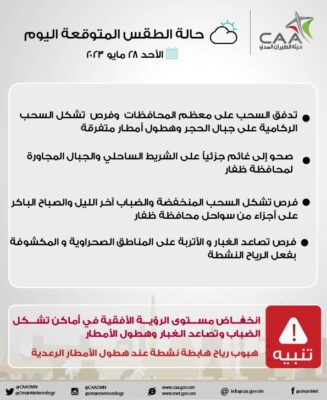 تدفق السحب على معظم المحافظات وفرص تشكل السحب الركامية على جبال الحجر وهطول أمطار متفرقة، والطقس صحو إلى غائم جزئياً على الشريط الساحلي والجبال المجاورة لمحافظة ظفار.
