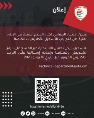 وهج الخليج - مسقط أعلن الاتحاد العماني لكرة القدم عبر حسابه الرسمي على موقع التواصل الاجتماعي تويتر، عن فتح باب التسجيل للأكاديميات الخاصة.