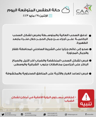 أعلنت هيئة الأرصاد الجوية عبر حسابها الرسمي على موقع التواصل الاجتماعي تويتر عن حالة الطقس المتوقعة اليوم الإثنين ٢٩ مايو ٢٠٢٣.