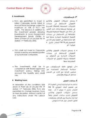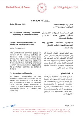 أصدر البنك المركزي العُماني تعميمًا رقم 41 لكافة شركات التمويل والتأجير التمويلي العاملة في سلطنة عمان حول الأنشطة المصرح بها لشركات التمويل والتأجير التمويلي.