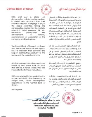 البنك المركزي العماني يصدر تعميمًا حول الأنشطة المصرح بها لشركات التمويل والتأجير التمويلي