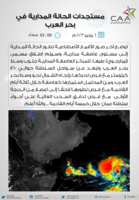 أعلنت هيئة الأرصاد الجوية عبر حسابها الرسمي على موقع التواصل الاجتماعي تويتر عن أخر مستجدات الحالة المدارية في بحر العرب
