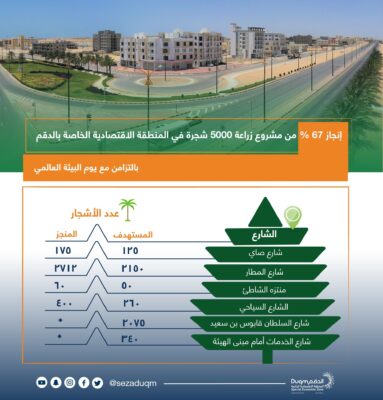 أعلنت المنطقة الاقتصادية الخاصة بالدقم ، أنه بالتزامن مع ‎يوم البيئة العالمي ،تم إنجاز 67% من مشروع زراعة 5000 شجرة في المنطقة الاقتصادية الخاصة بـ ‎الدقم في عدة مواقع حيوية تشمل الطرق الرئيسية والخدمية والمنتزهاتوذلك عبر استخدام أنظمة حديثة لريها واستغلال المياه المعالجة بالشكل الأمثل.