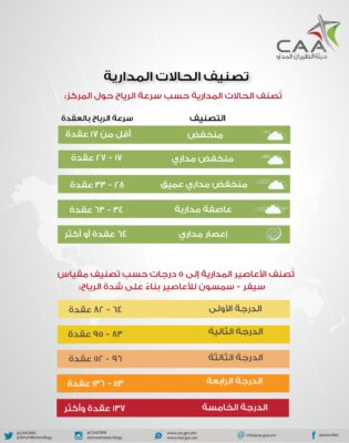 أعلنت هيئة الأرصاد الجوية عبر حسابها الرسمي على موقع التواصل الاجتماعي تويتر عن تصنيف الحالات المدارية حسب سرعة الرياح حول المركز.