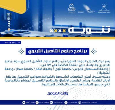 اصدرمركز القبول الموحد تنويهًا بأن برنامج دبلوم التأهيل التربوي سوف يُطرح للراغبين بالدراسة على النفقة الخاصة في كلا من :