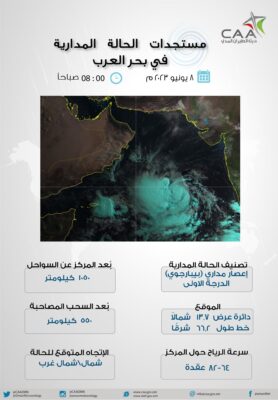 كشفت الارصاد الجوية العمانية عن آخر مستجدات الحالة الجوية ” بيبارجوي ” في بحر العرب كما هو موضح ادناه :