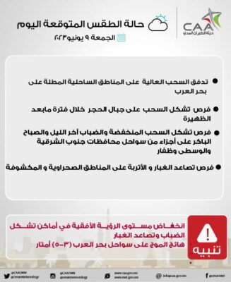 أعلنت هيئة الأرصاد الجوية عبر حسابها الرسمي على موقع التواصل الاجتماعي تويتر عن حالة الطقس اليوم, تدفق السحب العالية على المناطق الساحلية المطلة على بحر العرب فرص تشكل السحب على جبال الحجر خلال فترة ما بعد الظهيرة.
