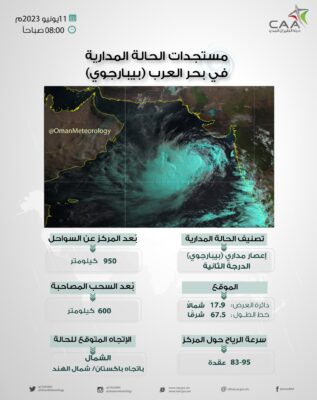 اصدرت الارصاد الجوية العمانية آخر مستجدات و تفاصيل الحالة المدارية (بيبارجوي) في بحر العرب حيث لاتزال الحالة المدارية إعصار من الدرجة الثانية يتحرك شمالاً باتجاه باكستان /شمال الهند ولا يوجد تأثير مباشر على سلطنة عمان مع استمرار التنبيه بارتفاع موج البحر على سواحل بحر العرب