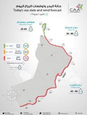 اعلنت هيئة الأرصاد الجوية عبر حسابها الرسمي على موقع التواصل الاجتماعي تويتر تنويهًا ، نظراً لأرتفاع موج البحر على سواحل سلطنة عمان وفرص امتداد وإرتفاع منسوب المياه في المناطق الساحلية المنخفضة والخيران خلال الفترة(12-14)يونيو2023 لذا يرجى تجنب ارتياد البحر وممارسة الأنشطة البحرية ويرجى من الصيادين الانتباه لإبعادوتثبيت القوارب خلال هذه الفترة.