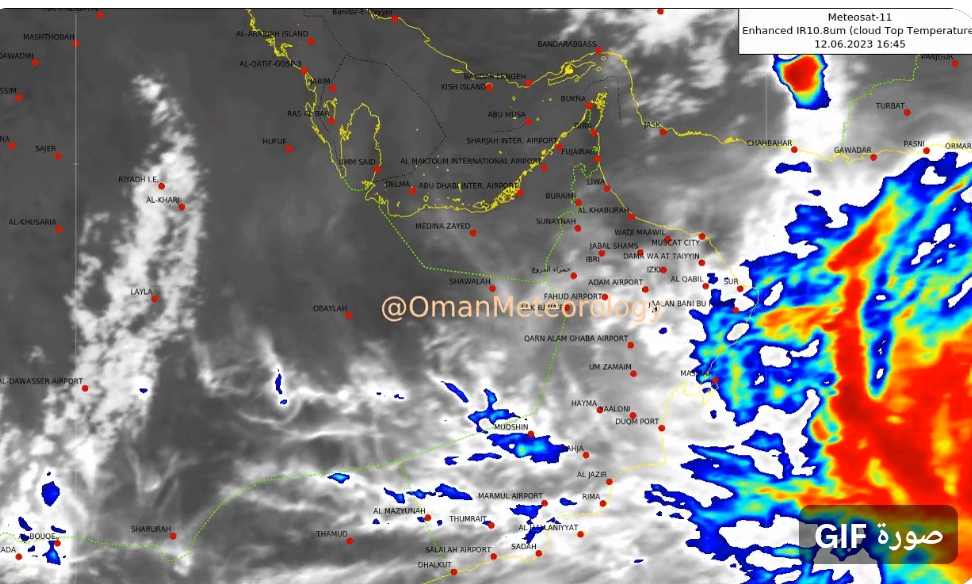 ومن المتوقع عبور الحالة المدارية يوم الخميس تاريخ 15 يونيو 2023 على المناطق الممتدة بين السواحل الهندية ( كوجرات والسواحل الباكستانية ( كراتشي ).