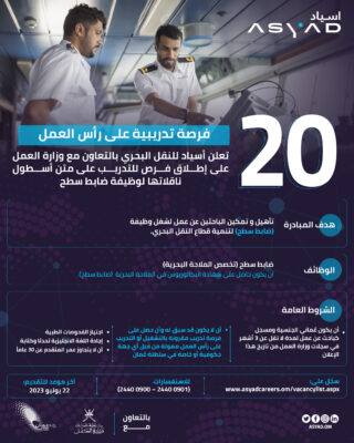 اعلنت مجموعة أسياد بالتعاون مع وزارة العمل تطرح 20 فرصة تدريبية على رأس العمل للباحثين عن عمل من حملة شهادة البكالوريوس في الملاحة البحرية لشغل وظيفة ضابط سطح.