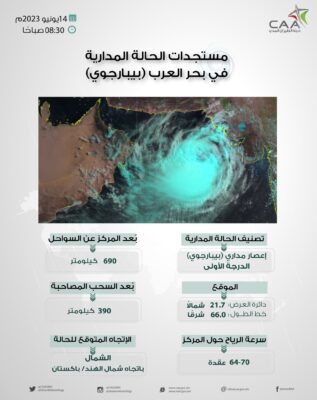 قالت الارصاد الجوية العمانية ان آخر مستجدات الحالة المدارية في بحر العرب، استمرار تحرك الإعصار المداري(بيبارجوي) من الدرجة الأولى شمالاً باتجاه السواحل الهندية الباكستانية.