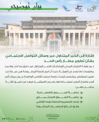 “تود هيئة الطيران المدني الإيضاح بأن الخبر المتداول غير دقيق بما احتواه من معلومات لم تصدر عن الهيئة، حيث أن المناقصة المطروحة هي عبارة عن تعيين استشاري متخصص لإعداد دراسة جدوى للأراضي الواقعة حول مطار رأس الحد واقتراح أفضل استخدام لها، وفرص الاستثمار فيها عن طريق ثلاثة