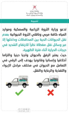 دعت وزارة الثروة الزراعية والسمكية وموارد المياه كافة مربي وناقلي الثروة الحيوانية بعدم نقل الحيوانات الحية بين المحافظات وداخلها إلا عبر وسائل نقل مغطاة نظراً للارتفاع الشديد في درجات الحرارة أثناء فترة الظهيرة. حيث يعتبر الرفق بالحيوان واجبا دينيا والتزاما أخلاقيا وإنسانيا وقانونيا يهدف إلى الرقي في التعامل مع الحيوان في مختلف مراحل الإيواء والتغذية والرعاية والنقل.