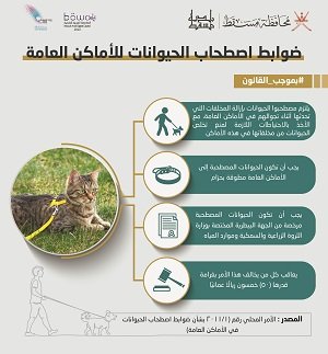 اعلنت بلدية مسقط عبر حسابها الرسمي على موقع التواصل الاجتماعي تويتر عن كيفية الالتزام بضوابط اصطحاب الحيوانات للأماكن العامة وفقاً للقانون ، كنل في المنشور التالي:-