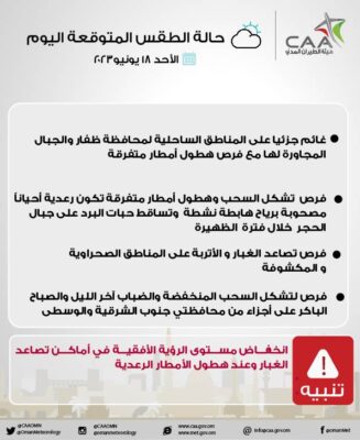 فرص لتشكل السحب المنخفضة والضباب آخر الليل والصباح الباكر على أجزاء من محافظتي جنوب الشرقية والوسطى،وانخفاض مستوى الرؤية الأفقية في أماكن تصاعد الغبار وعند هطول الأمطار الرعدية.