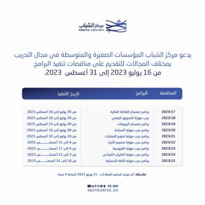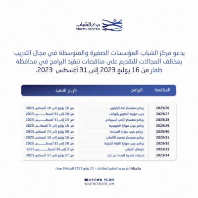 اعلن مركز الشباب عن دعوة المؤسسات الصغيرة والمتوسطة والأفراد أصحاب العمل المستقلين في مجال التدريب بمختلف المجالات للتسجيل في مناقصات تنفيذ حزمة البرامج الصيفية في المحافظات.