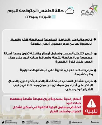 اعلنت هيئة الأرصاد الجوية عبر حسابها الرسمي على موقع التواصل الاجتماعي تويتر عن حالة الطقس المتوقعة اليوم الأثنين ١٩ يونيو ٢٠٢٣.