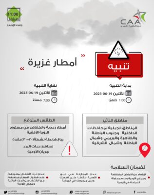 أعلنت هيئة الأرصاد الجوية عبر حسابها الرسمي على موقع التواصل الاجتماعي تويتر تنبيه بغزارة الأمطار .