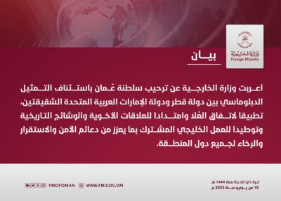 رحبت سلطنة عُمان باستئناف التمثيل الدبلوماسي بين دولة قطر ودولة الإمارات العربية المتحدة الشقيقتين، تطبيقًا لاتفاق العُلا وامتدادًا للعلاقات الأخويّة والوشائج التاريخيّة وتوطيدًا للعمل الخليجي المشترك بما يعزّز دعائم الأمن والاستقرار والرّخاء لجميع دول المنطقة.
