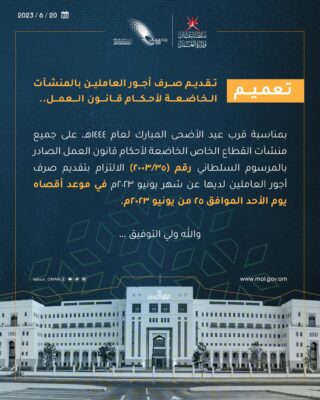 اعلنت وزارة العمل تعميم بشأن تقديم صرف أجور العاملين بالمنشآت الخاضعة لأحكام قانون العمل بمناسبة عيد الأضحى المبارك لعام ١٤٤٤هجري في موعد أقصاه يوم الأحد الموافق 25 من يونيو 2023م.