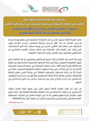 من جانب آخر تؤكد الهيئة العامة لسوق المال على ضرورة قيام أقسام علاقات المستثمرين في الجهات المشاركة في هذه العملية بمهامها المنوطة بها، خاصة تنظيم قنوات التواصل مع الجمهور والعمل بما جاء في ضوابط التفاعل بين الشركات المساهمة العامة والمحللين والمستثمرين والإعلامين الصادرة من الهيئة بقرار رقم (2022/109) .