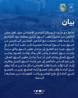 اصدرت بلدية ظفار بيان توضيحي حول ما ورد في وسائل التواصل الاجتماعي حول تضرر بعض البائعين من مشروع تطوير السوق المركزي بصلالة كما هو موضح في المنشور: