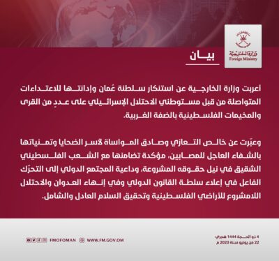 اصدرت وزارة الخارجية بيانًا تدين وتستنكر فيه سلطنة عمان الاعتداءات المتواصلة من قِبل مستوطني الاحتلال الإسرائيلي على عددٍ من القرى والمخيمات الفلسطينية بالضفة الغربية، مُعبّرةً عن خالص التعازي وصادق المواساة لأسر الضحايا وتمنياتها بالشفاء العاجل للمصابين، مؤكدةً تضامنها مع الشعب الفلسطيني الشقيق في نيل حقوقه المشروعة.