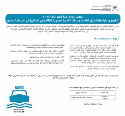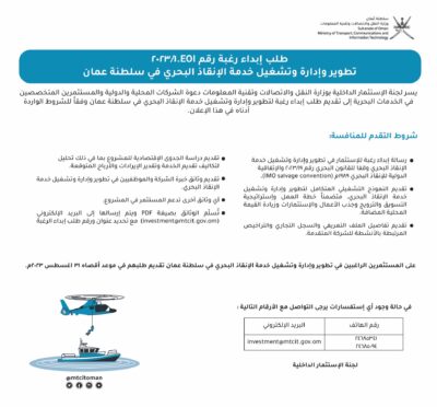 اعلنت وزارة النقل والاتصالات وتقنية المعلومات عبر حسابها الرسمي على موقع التواصل الاجتماعي تويتر عن فرصتين استثماريتين (إبداء الرغبة) في الخدمات البحرية و النقل البحري المتمثلة في نشاط التاكسي المائي وخدمة الإنقاذ البحري ، والشروط كما بالمنشور التالي:-