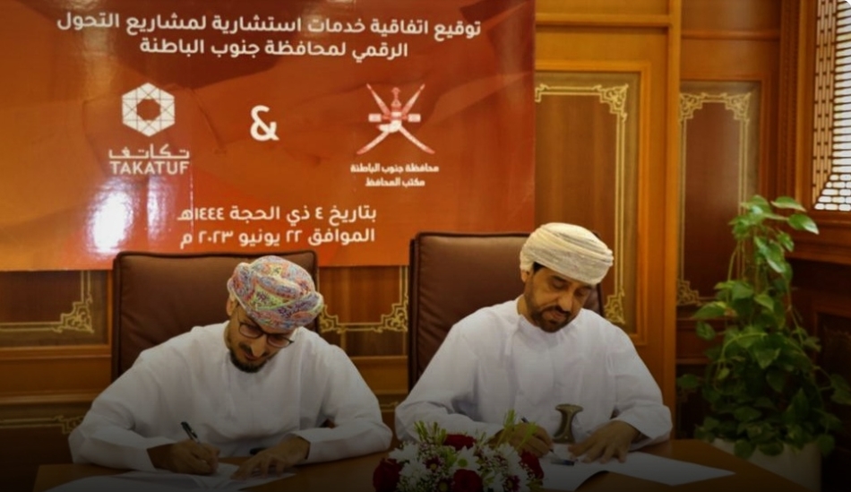وقّع على الاتفاقية سعادة الشيخ سيف بن حمير الشحي محافظ جنوب الباطنة وإبراهيم بن محمد الحارثي الرئيس التنفيذي لشركة تكاتف عُمان، حيث تنص الاتفاقية على أن تكون الشركة هي الاستشاري والمشرف لدعم ومتابعة تنفيذ مشروعات التحول الرقمي للمؤسسات الحكومية في المحافظة.