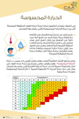 اعلنت هيئة الأرصاد الجوية عبر حسابها الرسمي على موقع التواصل الاجتماعي تويتر ردًا على تساؤلات في الكثيرون لماذا درجة حرارة الهواء الحقيقة المسجلة أقل من درجة الحرارة المحسوسة والتي يشعر بها الشخص.